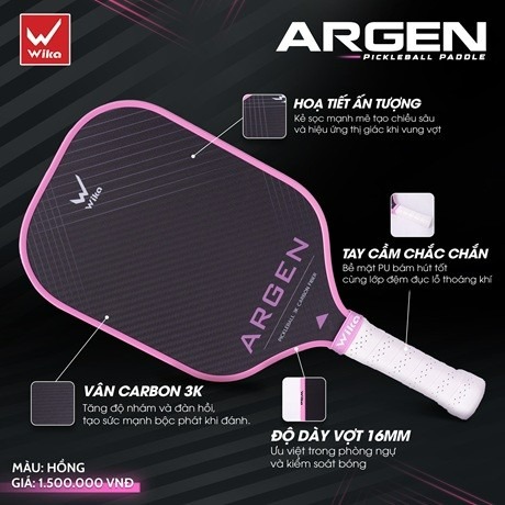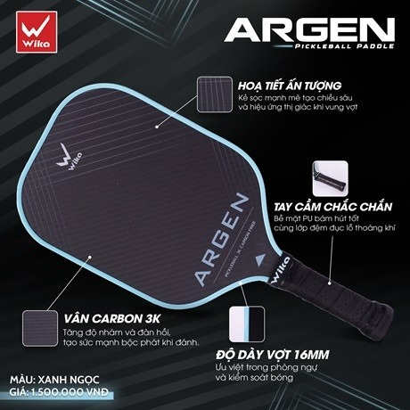 Wika Argen là mẫu vợt pickleball cao cấp, được thiết kế dành riêng cho những người chơi yêu thích lối đánh kỹ thuật, kiểm soát bóng và điều phối nhịp độ trận đấu một cách linh hoạt. Với cấu tạo hiện đại từ carbon 3K và lõi tổ ong PP dày 16mm, Argen mang đến sự kết hợp tối ưu giữa sức mạnh, cảm giác bóng và khả năng tạo xoáy vượt trội.